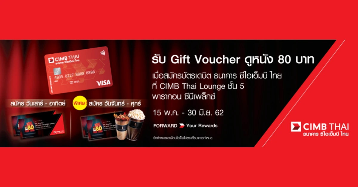 สมัครบัตรเดบิตธนาคาร ซีไอเอ็มบี ไทย ที่บริเวณ CIMB Thai Lounge พับบลิคเลาจน์ ชั้น 5 พารากอน ซีนีเพล็กซ์ รับ Gift Voucher ป๊อบคอร์นและเครื่องดื่ม ขนาดปกติ จำนวน 1 ชุด มูลค่า 215 บาท และรับ Gift Voucher ดูหนัง 80 บาท จำนวน 2 ใบ