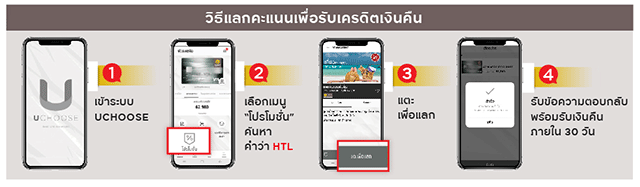 - แลก: แลกคะแนนสะสม 3,000 คะแนนผ่านแอปฯ UCHOOSE ฟรี พิมพ์คำค้นหาหน้าโปรโมชั่น 'HTL'