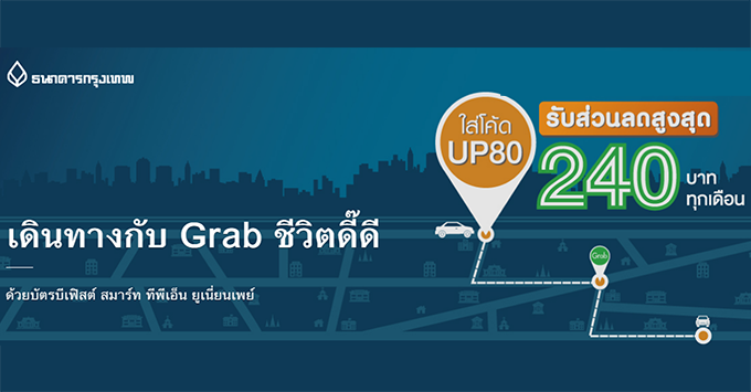 เดินทางกับ Grab ชีวิตดี๊ดี...รับส่วนลดสูงสุด 240 บาท/เดือน เมื่อชำระเงินผ่านบัตรบีเฟิสต์ สมาร์ท ทีพีเอ็น ยูเนี่ยนเพย์ เพียงใส่ Code : UP80 ตั้งแต่ 15 มี.ค. 62 - 15 ก.ย. 62
