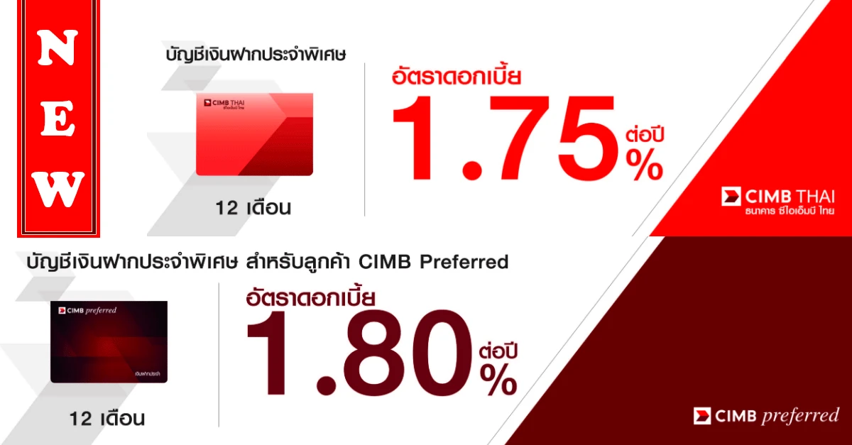 - บัญชีเงินฝากประจำพิเศษ 12 เดือน Preferred* เป็นบัญชีสำหรับลูกค้า CIMB Preferred ประเภทลูกค้าบุคคลธรรมดาเท่านั้น หรือสมัครเป็นลูกค้า CIMB Preferred ในวันและเวลาเดียวกันกับการขอเปิดบัญชี