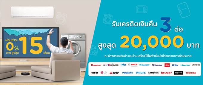 - สะสมยอดผ่อนชำระครบ 100,000 บาท ภายในวันเดียวกัน รับเงินคืน 5,000 บาท (ลูกค้าจะได้รับเครดิตเงินเพียงอย่างใดอย่างหนึ่งเท่านั้น)