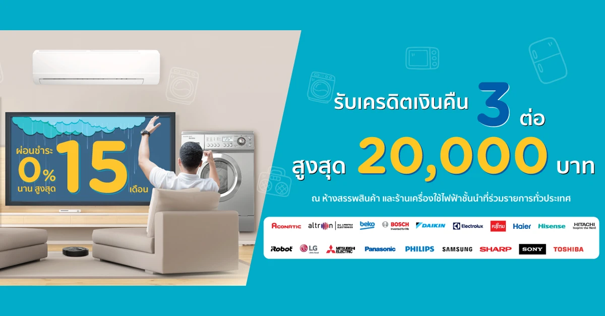 สุขไม่จำกัดรับหน้าฝน กับบัตร KTC...สิทธิพิเศษสำหรับสมาชิกบัตร KTC เมื่อซื้อทีวี, เครื่องเสียง, เครื่องอบผ้า, เครื่องปรับอากาศ, เครื่องฟอกอากาศ, เครื่องดูดฝุ่น และตู้เย็น เฉพาะแบรนด์ที่ร่วมรายการ