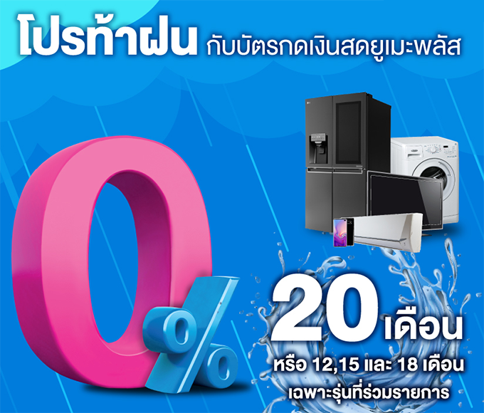 โปรฯ ท้าฝน...กับบัตรกดเงินสดยูเมะพลัส ผ่อน 0% นาน 20 เดือน หรือ 12, 15 และ 18 เดือน เฉพาะรุ่นที่ร่วมรายการ ตั้งแต่วันที่ 15 มิถุนายน - 15 กรกฎาคม 2562