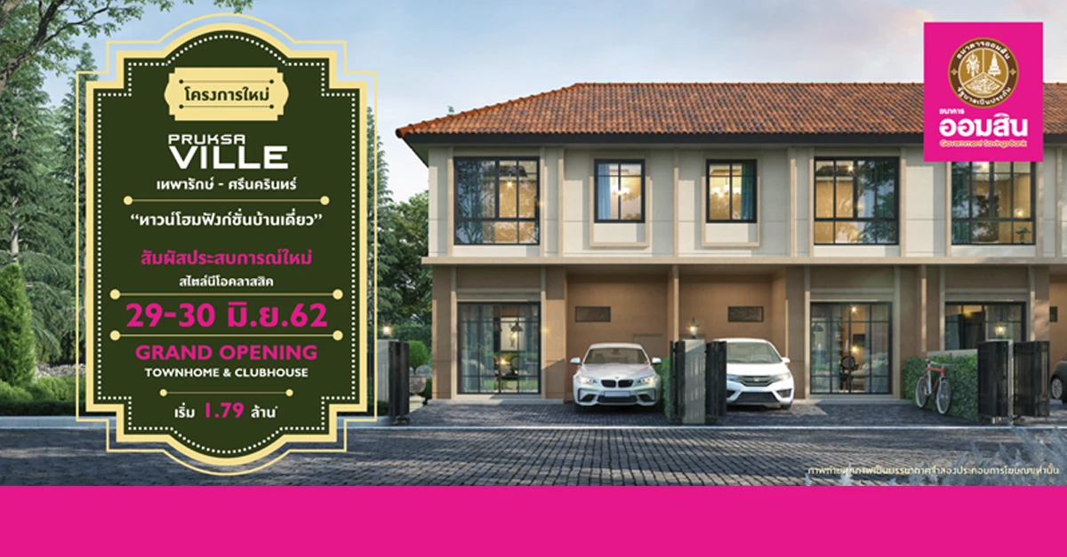รับส่วนลด Ontop จากส่วนลดปกติ 20,000 บาท สิทธิพิเศษสำหรับลูกค้า ธ.ออมสิน โครงการ Pruksa Ville เทพารักษ์-ศรีนครินทร์