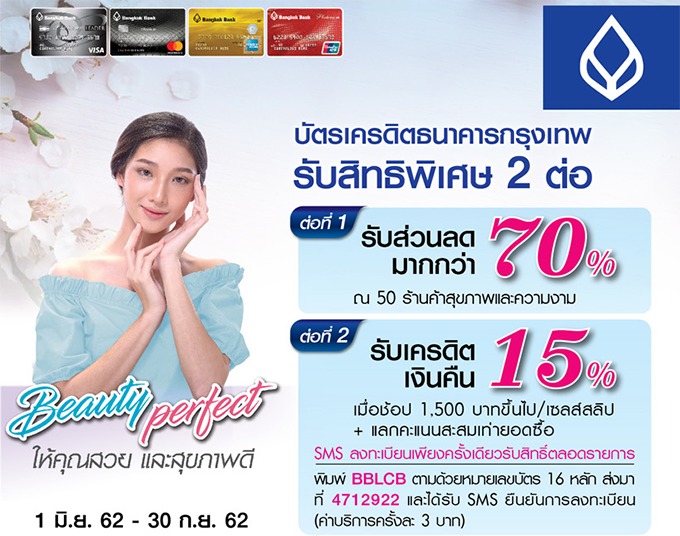 • ต่อที่ 1 : รับส่วนลดมากกว่า 70% ณ ร้านค้าสุขภาพและความงามที่ร่วมรายการ (ตรวจสอบรายชื่อร้านค้าร่วมรายการได้ที่ www.bangkokbank.com) เงื่อนไขส่วนลด/สิทธิพิเศษ เป็นไปตามที่ร้านค้ากำหนด โปรดตรวจสอบเพิ่มเติม ณ จุดขาย