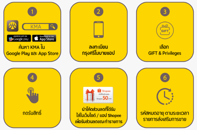 - กดรับสิทธิ์ผ่านเมนู GIFT & Privileges บน KMA โดยนำโค้ดส่วนลดที่ได้รับใส่ใน https://shopee.co.th หรือ Shopee Application เพื่อรับส่วนลดมูลค่า 50 บาท