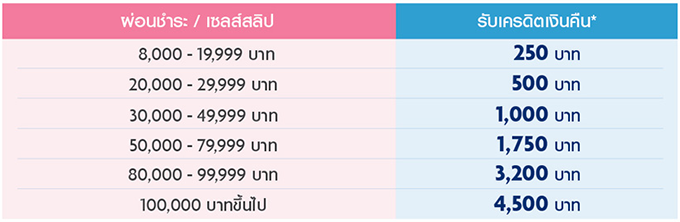 - จำกัดการรับเครดิตเงินคืนสูงสุด 18,000 บาท / ผู้ถือบัตร1 ท่าน / ตลอดระยะเวลาส่งเสริมการขาย