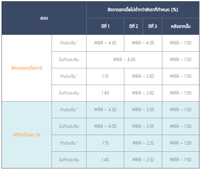 - ทำประกันคุ้มครองวงเงินสินเชื่อ (MRTA / GLTSP) 70% ของวงเงินกู้ และ ระยะเวลาทำประกันขั้นต่ำ 15 ปี