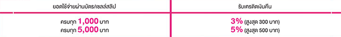 เงื่อนไขการร่วมกิจกรรม - เกณฑ์การคำนวณยอดเครดิตเงินคืนมียอดใช้จ่าย ณ ร้านค้าออนไลน์ที่ร่วมรายการครบทุก 1,000 บาทต่อเซลส์สลิป รับเครดิตเงินคืน 3% (30 บาทสูงสุด 300 บาท) หรือครบทุก 5,000 บาทต่อเซลส์สลิป รับเครดิตเงินคืน 5% (250 บาท สูงสุด 500 บาท)