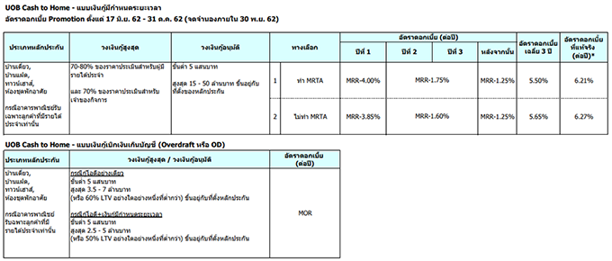 - อัตราดอกเบี้ยแบบทำ MRTA ลูกค้าต้องทำประกันเต็มวงเงินกู้ และมีระยะเวลาเอาประกันขั้นต่ำ 10 ปี หรือทุนประกันขั้นต่ำ 80% ของวงเงินกู้และมีระยะเวลาเอาประกันเต็มตามระยะเวลากู้