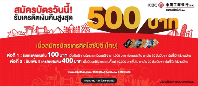 บัตรเครดิตไอซีบีซี (ไทย) วันนี้ รับเครดิตเงินคืนสูงสุด 500 บาท