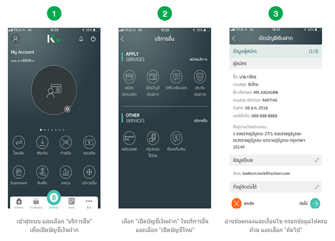 - เปิดบัญชีผ่านแอปพลิเคชัน K PLUS และสำหรับลูกค้าที่เปิดบัญชีพร้อมสมัครบริการ K PLUS ต้องพิสูจน์ตัวตนที่สาขาของธนาคารหรือจุดบริการยืนยันตัวตน (K CHECK ID) ที่ธนาคารกำหนด