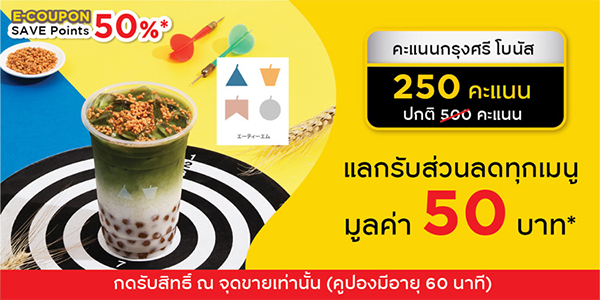 1. E-COUPON ATM Tea Bar : แลกรับส่วนลดทุกเมนู มูลค่า 50 บาท ใช้ 250 พอยต์ จากปกติ 500 พอยต์ ATM Tea Bar มี 7 สาขา ร่วมรายการทุกสาขา >> สาขาสยามสแควร์, สาขาเซ็นทรัลลาดพร้าว, สาขาไอคอนสยาม, สาขาเซ็นทรัลเอ็มบาสซี, สาขาเซ็นทรัลพระราม 9, สาขาเซ็นทรัลเวิลด์ และสาขาฟิวเจอร์พาร์ครังสิต
