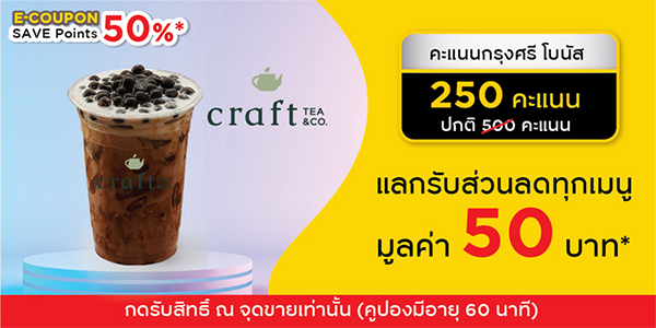 3. E-COUPON Craft Tea & Co : แลกรับส่วนลดทุกเมนู มูลค่า 50 บาท ใช้ 250 พอยต์ จากปกติ 500 พอยต์ Craft Tea & Co มี 3 สาขา ร่วมรายการทุกสาขา >> สาขาเซ็นทรัลเวิลด์, สาขาทรูดิจิตอล พาร์ค 101 ปุณณวิถี และสาขาเซ็นทรัลพลาซ่า ลาดพร้าว