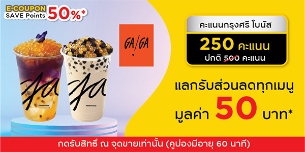 4. E-COUPON Ga Ga : แลกรับส่วนลดทุกเมนู มูลค่า 50 บาท ใช้ 250 พอยต์ จากปกติ 500 พอยต์ GA GA มี 7 สาขา ร่วมรายการทุกสาขา >> สาขาเซ็นทรัลเวิลด์, สาขาแพลทินั่ม แฟชั่นมอลล์ ประตูน้ำ, สาขาฟิวเจอร์พาร์ค รังสิต, สาขาเซ็นทรัลพลาซา เวสต์เกต, สาขาเซ็นทรัลพลาซา ลาดพร้าว, สาขาเซ็นทรัลพลาซา ปิ่นเกล้า และสาขาเซ็นทรัลเฟสวัล อีสต์วิลล์