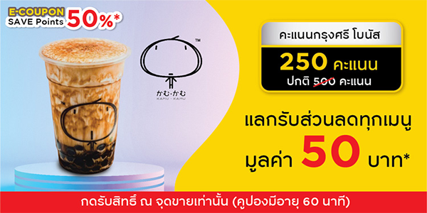 5. E-COUPON KAMU : แลกรับส่วนลดทุกเมนู มูลค่า 50 บาท ใช้ 250 พอยต์ จากปกติ 500 พอยต์ KAMU เฉพาะสาขาที่ร่วมรายการ จำนวน 38 สาขา >> Interchange, Exchange Tower, MRT ( BTS Asok ), Terminal 21, Center Point of Siam, Siam Square 1, BTS Chong Non Si, Sindhorn Tower, All Seasons Place1, Lotus Fortune, Lotus Sukhapiban 1, Central Pinklao, Ploenchit Center, Sathornthani, Lotus On Nut, AIA Sathorn, G-Tower, BTS Thonglor, SUN Tower, FYI Center, Air Port Link Phayatai, Century Mall On Nut, Futuer Park Ragsit, All Seasons Place 2, Tops Central Rama 9, Tops Central Ladprao, BTS Chid Lom, Tops Central World, Icon Siam, Silom Connect, Tops Central Chaengwattana, Mega Bangna, BTS Ploenchit, Sing Complex, Cosmo Bazaar, Amarin Plaza, SCB Park และ Silom Complex