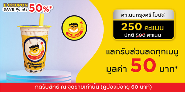 7. E-COUPON Mr. Shake : แลกรับส่วนลดทุกเมนู มูลค่า 50 บาท ใช้ 250 พอยต์ จากปกติ 500 พอยต์ Mr. Shake เฉพาะสาขาที่ร่วมรายการ จำนวน 18 สาขา >> สยามสแควร์, สีลมคอมเพล็กซ์, BTS ศาลาแดง, BTS อารีย์, BTS ชิดลม (ฝั่งทางออกเซ็นทรัลเวิล์ด), BTS เพลินจิต, พาราไดซ์พาร์ค, ฟิวเจอร์พาร์ครังสิต, เซ็นทรัลรัตนาธิเบศร์, เซ็นทรัลพระราม 2, เซ็นทรัลลาดพร้าว, เซ็นทรัลพระราม 9, เซ็นทรัลบางนา, เซ็นทรัลแจ้งวัฒนะ, คริสตัลพาร์ค, เดอะมอลล์ท่าพระ, ฟอร์จูนทาวเวอร์ และปตท. วิภาวดี