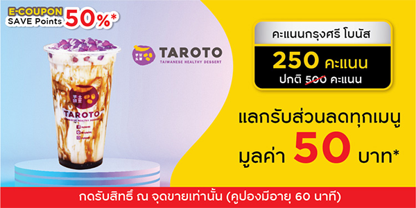 8. E-COUPON Taroto : แลกรับส่วนลดทุกเมนู มูลค่า 50 บาท ใช้ 250 พอยต์ จากปกติ 500 พอยต์ Taroto มี 6 สาขา ร่วมรายการทุกสาขา >> สาขาเซ็นทรัล ปิ่นเกล้า ชั้น G (หน้าท็อปส์ มาร์เก็ต), สาขาเซ็นทรัล เวิลด์ ชั้น 3 (โซนเอเทรียม), สาขาเซ็นทรัล พระราม 3 ชั้น 5 (ฝั่งโรงหนัง), สาขาเซ็นทรัล พระราม 2 ชั้น 3 (ฝั่งโรงหนัง), สาขาเกตเวย์ แอท บางซื่อ ชั้น G และสาขาฟิวเจอร์พาร์ค รังสิต ชั้น B (โซนโรบินสัน)