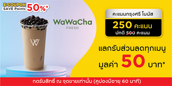 9. E-COUPON WAWA CHA : แลกรับส่วนลดทุกเมนู มูลค่า 50 บาท ใช้ 250 พอยต์ จากปกติ 500 พอยต์ WAWA CHA มี 7 สาขา ร่วมรายการทุกสาขา >> สาขาฟิวเจอร์ปาร์ครังสิต ชั้น 1, สาขาเซ็นทรัลพลาซ่า ปิ่นเกล้า, สาขาเทสโก้โลตัส ถลาง, สาขาเซ็นทรัลพลาซ่า พระราม 9, สาขาเซ็นทรัลพลาซ่าอุดรธานี, สาขาเมกาบางนา และสาขาเซ็นทรัลพลาซ่า พระราม 3