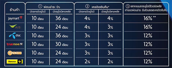 - ผ่อนชำระ 0% สูงสุด 10 เดือน สำหรับบัตรเครดิตยูโอบี และสูงสุด 36 เดือน สำหรับบัตรยูโอบีแคชพลัส และรับเครดิตเงินคืน เมื่อผ่อนชำระ สินค้าตั้งแต่ 10 เดือนขึ้นไป ต่อ เซลส์สลิป ระยะเวลาการผ่อนชำระและการรับเครดิตเงินคืนของแต่ละร้านค้า ตามที่ระบุไว้ในตารางหน้าสื่อโฆษณาและสำหรับร้านเจมาร์ทและ TG Fone เฉพาะการผ่อนชำระเครื่องเปล่าเท่านั้น