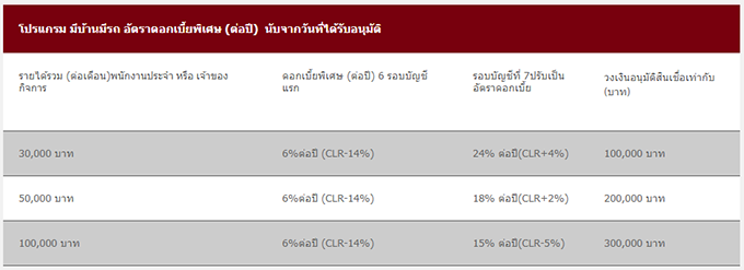 - กลุ่มลูกค้า พนักงานประจำ และเจ้าของกิจการ ดอกเบี้ยพิเศษ 6% ต่อปี นาน 6 รอบบัญชีแรก นับจากวันที่ได้รับอนุมัติ