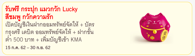 รับฟรี!! กระปุกแมวกวัก Lucky สีชมพู เมื่อเปิดบัญชีเงินฝากออมทรัพย์จัดให้ พร้อมทำบัตรกรุงศรี เดบิต ออมทรัพย์จัดให้ ด้วยวงเงินเปิดบัญชีขั้นต่ำ 500 บาท และเพิ่มบัญชีเข้า KMA ตั้งแต่วันนี้ - 30 ก.ย. 62