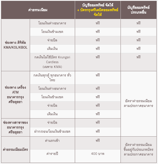 - ฟรี ค่าธรรมเนียมโอนเงินข้ามเขต ชำระค่าสินค้าและบริการ และการเติมเงิน ผ่านช่องทาง KMA, KOL, KBOL, เครื่อง ATM ธนาคารกรุงศรีอยุธยา และสาขาธนาคาร ไม่จำกัดจำนวนครั้ง