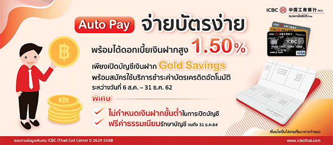 Auto Pay จ่ายบัตรง่าย พร้อมได้ดอกเบี้ยเงินฝากสูง 1.50% ต่อปี จาก ICBC พร้อมรับสิทธิพิเศษ 2 ต่อ