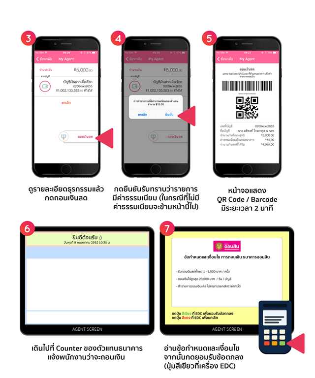 - การถอนเงิน : ไม่เกิน 5,000 บาท/ครั้ง สูงสุด 20,000 บาท/วัน/ราย
