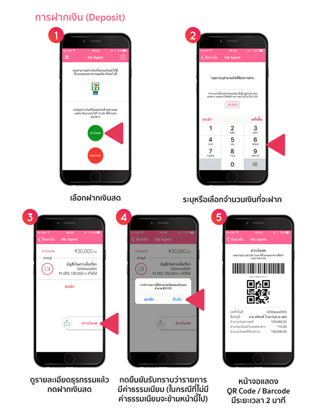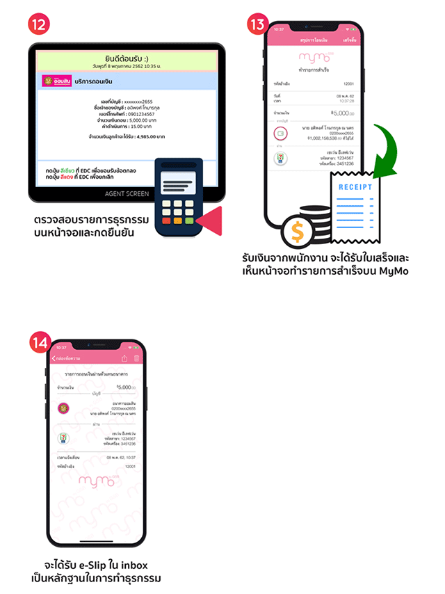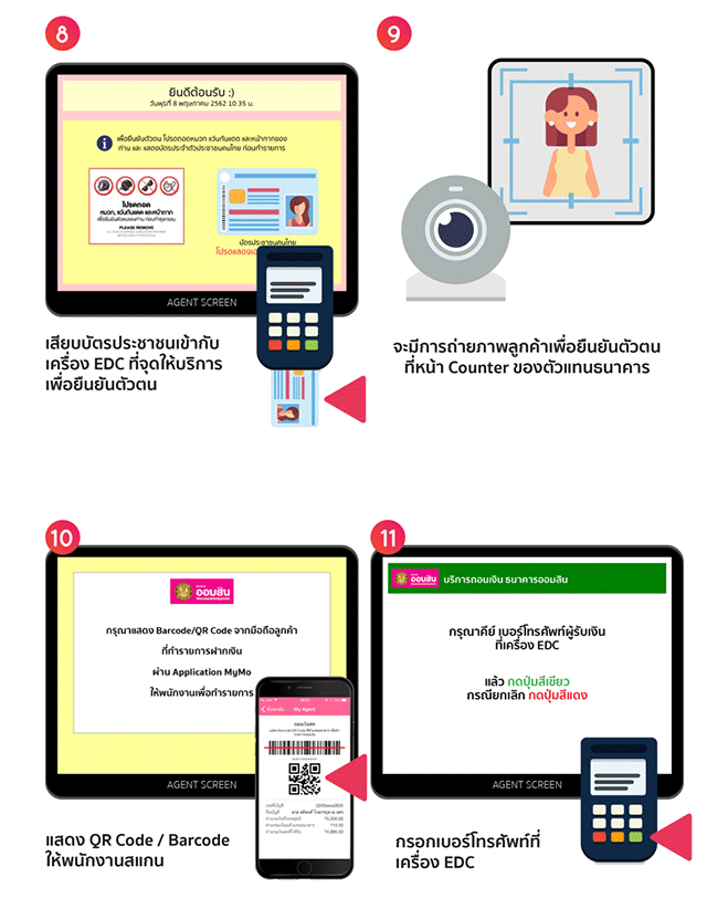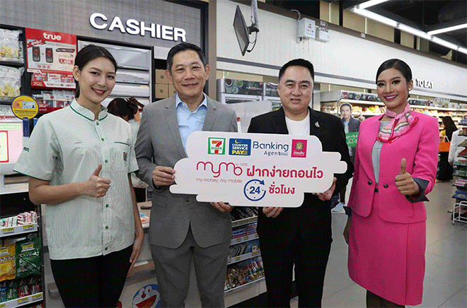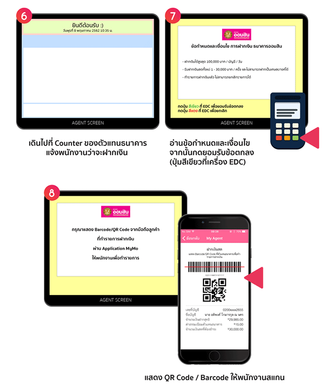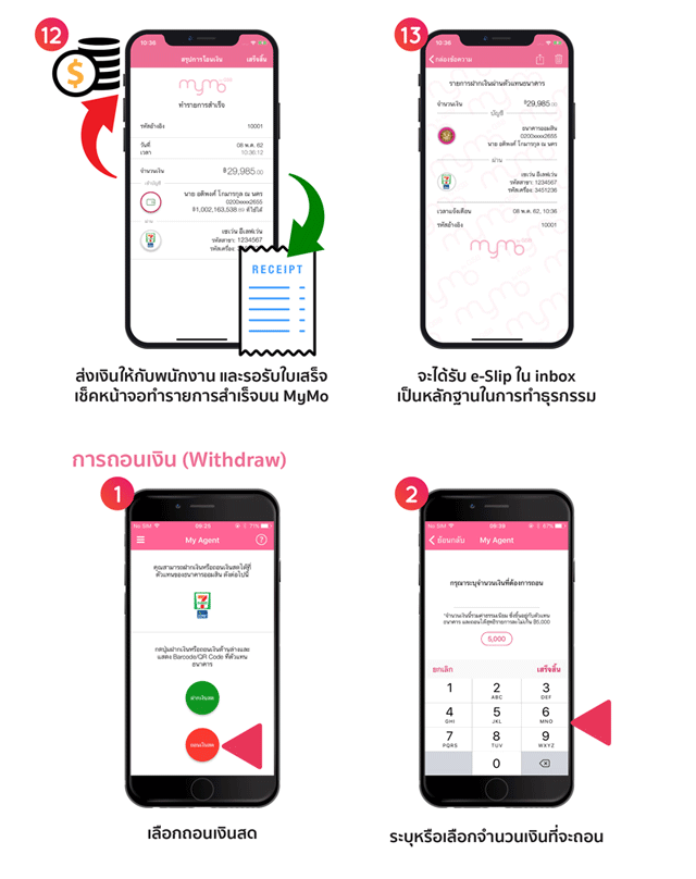 สำหรับการฝากเงิน-ถอนเงินสดผ่านเมนู My Agent บน MyMo ลูกค้าสามารถทำรายการฝากเงิน-ถอนเงินบน MyMo แล้วนำ QR Code/Barcode ที่ปรากฏบน MyMo ไปแสดง ณ จุดให้บริการเคาน์เตอร์เซอร์วิส ในร้านเซเว่นอีเลฟเว่น พร้อมแสดงบัตรประจำตัวประชาชน