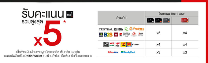- รับคะแนนสะสม The 1 x5 เมื่อใช้จ่ายที่ ห้างสรรพสินค้าเซ็นทรัล, ห้างสรรพสินค้าโรบินสัน, ห้างสรรพสินค้าเซน, Payless ShoeSource, Supersports และร้านค้าในเครือ CRC Sports, Marks & Spencer, Komonoya, B2S, MUJI, ร้านอาหารในเครือ Central Restaurants Group หรือ Segafredo Zanetti Espresso ทุกๆ 25 บาทได้รับ 5 คะแนน โดย 1 คะแนนแรก ได้รับภายในวันที่ทำรายการ ส่วนอีก 4 คะแนนได้รับภายใน 3 วัน (ยกเว้นกรณีร้านอาหารในเครือ Central Restaurants Group ที่จะได้รับทั้ง 5 คะแนนภายใน 3 วัน)