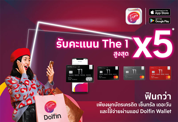 รับคะแนน The 1 สูงสุด x5 ฟินกว่า เพียงผูกบัตรเครดิต เซ็นทรัล เดอะวัน และใช้ผ่านแอปฯ Dolfin Wallet