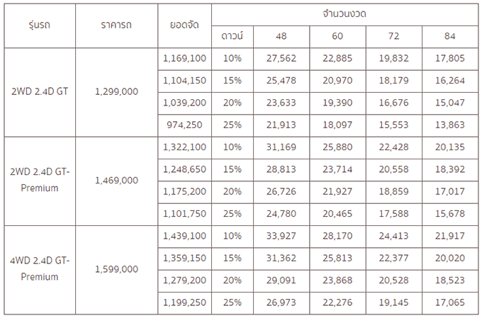 ตารางผ่อนชำระตามอัตราดอกเบี้ยสำหรับ New Pajero Sport