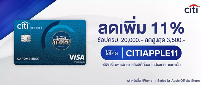 ลดเพิ่ม 11% เมื่อซื้อ iPhone 11 Series ที่ Lazada ผ่านบัตรเครดิตซิตี้ รีวอร์ด วันนี้ - 31 ต.ค. 62