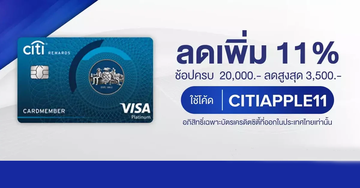 • ลูกค้าที่ซื้อโทรศัพท์มือถือ iPhone 11 Series จาก Apple ใช้โค้ด CITIAPPLE11 รับส่วนลด 11% ลดสูงสุด 3,500 บาท เมื่อช้อปครบตั้งแต่ 20,000 บาทขึ้นไป/เซลส์สลิป