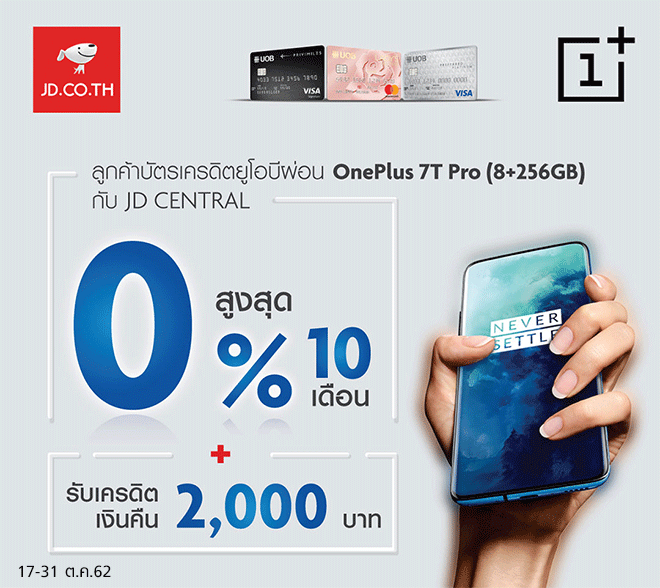 เงื่อนไขรายการ - รายการส่งเสริมการขายนี้ สำหรับการสั่งซื้อแบบผ่อนชำระ Oneplus 7T Pro (8+256) ระหว่างวันที่ 17 -31 ตุลาคม 2562 เฉพาะผู้ถือบัตรเครดิตธนาคารยูโอบีทุกประเภท ที่ออกในประเทศไทยเท่านั้น (ยกเว้นบัตรเครดิตเพื่อธุรกิจ และบัตร TMRW) เมื่อชำระค่าสินค้าผ่านบริการผ่อนชำระแบบ UOB i-Plan ผ่านช่องทาง JD Central Application ประเทศไทย