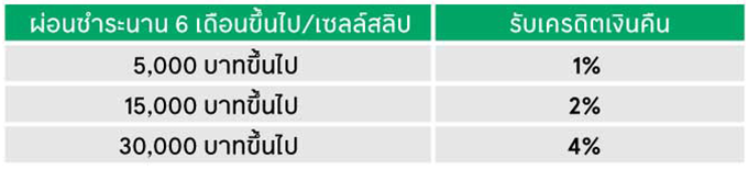 • ยอดผ่อนชำระ 5,000 บาทขึ้นไป/เซลล์สลิป/กรมธรรม์ นาน 6 เดือนขึ้นไป รับเครดิตเงินคืน 1%