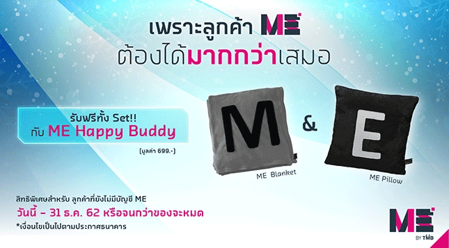 พิเศษ! สำหรับลูกค้าใหม่ที่ยังไม่เคยเป็นลูกค้า ME เพียงนำบัตรประชาชน และสมุดบัญชีออมทรัพย์ธนาคารใดก็ได้ที่เป็นชื่อคุณ มาเปิดบัญชี ME SAVE ที่ ME Place พร้อมฝากเงินตั้งแต่ 1,000 บาทขึ้นไป และดาวน์โหลด ME by TMB App ที่สาขา TMB ที่ร่วมรายการ รับทันที! ME Happy Buddy Set (หมอน และผ้าห่ม) มูลค่า 699 บาท
