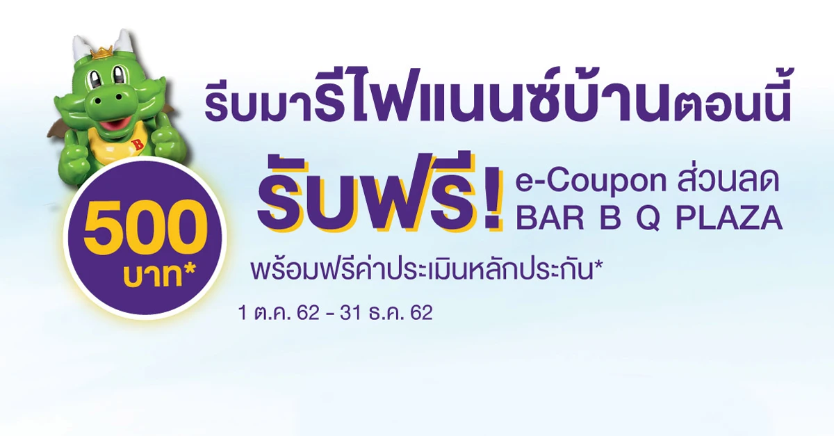 สิทธิพิเศษสำหรับลูกค้าสินเชื่อบ้านรีไฟแนนซ์ SCB รับฟรี e-Coupon ส่วนลดบาร์บีคิวพลาซ่า มูลค่า 500 บาท ผ่านแอปฯ SCB EASY ใช้เป็นส่วนลดเมื่อรับประทานอาหารและเครื่องดื่มที่บาร์บีคิวพลาซ่า พร้อมรับฟรีค่าประเมินหลักประกัน ตั้งแต่วันที่ 1 ต.ค. 62 - 31 ธ.ค. 62