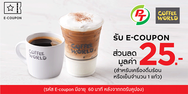 สิทธิพิเศษ 3 ที่ปั๊มน้ำมันพีที : รับ E-COUPON ส่วนลด 25 บาท*** สำหรับเมนูเครื่องดื่มร้อนหรือเย็นที่ร้าน Coffee World จำนวน 1 แก้ว เพียงเติมน้ำมันพีที ครบ 800 บาท/สลิป