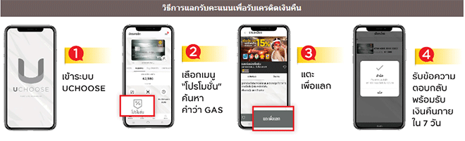 - แลก : แลกคะแนนสะสม 800 คะแนนผ่านแอปพลิเคชัน UChoose หลังจากการรูดบัตรภายในวันเดียวกัน โดยพิมพ์คำค้นหาโปรโมชั่นว่า "GAS"