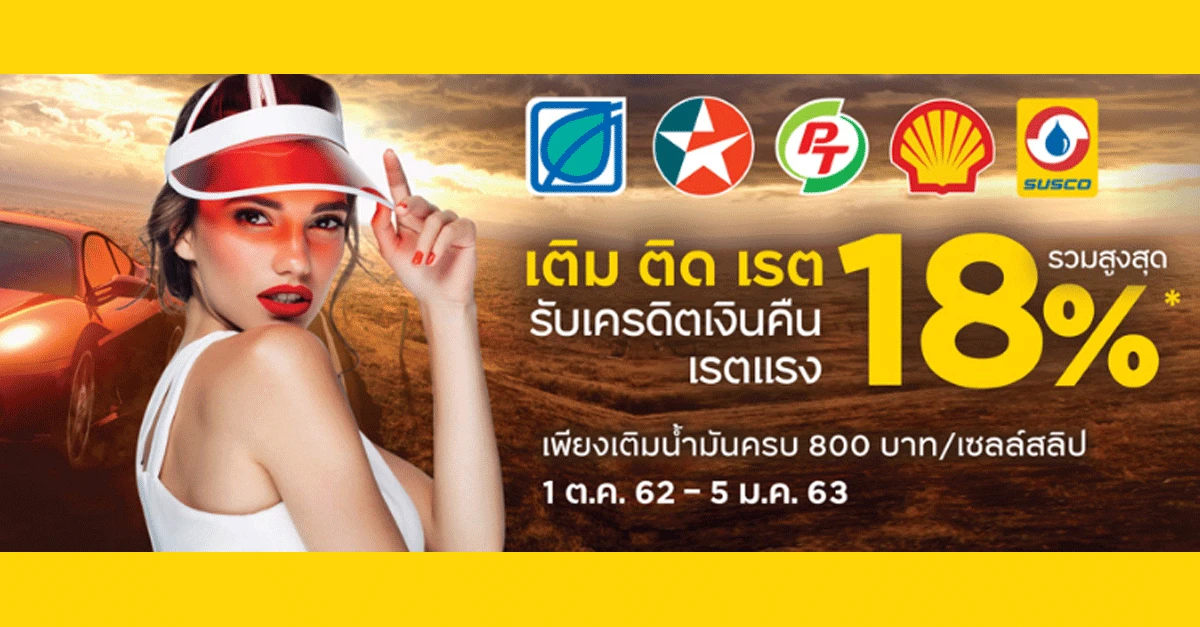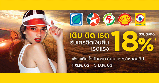 เติม ติด เรต รับเครดิตเงินคืนเรตแรงรวมสูงสุด 18%* ที่ปั๊มน้ำมันพีที, ปั๊มน้ำมันคาลเท็กซ์, ปั๊มน้ำมันเชลล์ และปั๊มน้ำมันซัสโก้