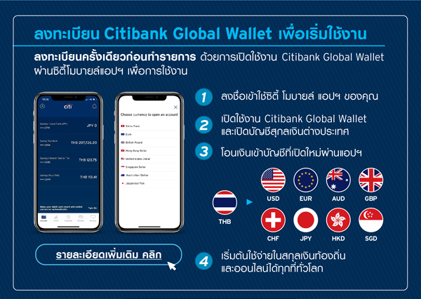 ต่อที่ 1 รับเครดิตเงินคืนสูงสุด 5% เมื่อเปิดใช้งาน Citibank Global Wallet และใช้จ่ายผ่านบัญชีสกุลเงินต่างประเทศ 20,000 บาทขึ้นไป