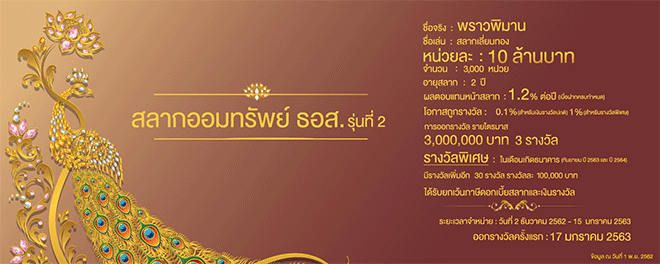 ธนาคารอาคารสงเคราะห์ (ธอส.) เพิ่มทางเลือกใหม่ในการออม จัดทำสลากออมทรัพย์ ธอส. รุ่นที่ 2 ชุดพราวพิมาน สลากเลี่ยมทองซุปเปอร์พรีเมี่ยมมูลค่าหน่วยละ 10 ล้านบาท จำนวน 3,000 หน่วย รวม 30,000 ล้านบาท อายุสลาก 2 ปี ออกรางวัลไตรมาสละ 1 ครั้ง ครั้งละ 3 รางวัล มูลค่ารางวัลละ 3 ล้านบาท คิดเป็นโอกาสในการถูกรางวัล 0.1% และ พิเศษ!! เฉพาะในเดือนกันยายน 2563 และกันยายน 2564 ได้สิทธิ์ลุ้นรับรางวัลพิเศษมูลค่า 100,000 บาท เพิ่มอีกจำนวน 30 รางวัล/เดือน คิดเป็นโอกาสในการถูกรางวัลพิเศษสูงถึง 1% ฝากครบ 2 ปี รับเงินต้นพร้อมดอกเบี้ยหน่วยละ 240,000 บาท เริ่มจำหน่ายตั้งแต่วันที่ 2 ธันวาคม 2562 - 15 มกราคม 2563 และออกรางวัลครั้งแรก 17 มกราคม 2563