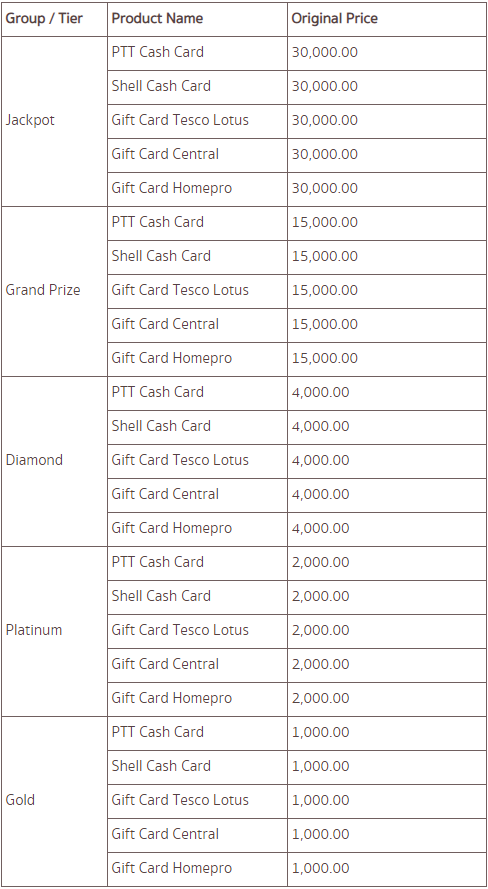 - รายละเอียดของกำนัล แบ่งออกเป็น 5 ประเภท คือ Jackpot, Grand Prize, Diamond, Platinum, Gold
