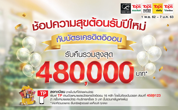 ข้อกำหนดและเงื่อนไข - สิทธิพิเศษสำหรับผู้ถือบัตรเครดิตทุกประเภท (ยกเว้นบัตรเครดิตเพื่อองค์กร) ของบริษัท อิออน ธนสินทรัพย์ (ไทยแลนด์) จำกัด (มหาชน) ("บริษัทฯ") เมื่อมียอดใช้จ่ายที่เซ็นทรัล ฟู้ด ฮอลล์, ท็อปส์ มาร์เก็ต, ท็อปส์ ซูเปอร์สโตร์, ท็อปส์ เดลี่ทุกสาขา และ ซูเปอร์คุ้มสาขาที่ร่วมรายการ ตามเงื่อนไขที่กำหนด ระหว่างวันที่ 1 พ.ย. 62 - 7 ม.ค. 63