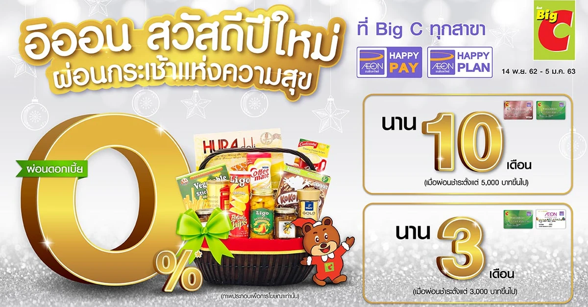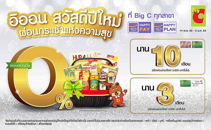 - เมื่อผ่อนชำระกระเช้าปีใหม่ ผ่านบริการ AEON Happy Pay หรือบริการ AEON Happy Plan เฉพาะบัตรสินเชื่อบิ๊กซี เอ็กซ์คลูซีฟ และบัตรเครดิตบิ๊กซี แพลทินัม เพย์เวฟ และได้รับอนุมัติยอดสินเชื่อ ตั้งแต่ 5,000 บาทขึ้นไป ต่อเซลล์สลิป รับสิทธิ์ผ่อนชำระอัตราดอกเบี้ย 0% นาน 10 เดือน