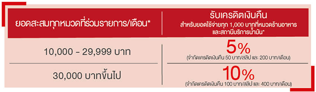 รับเครดิตเงินคืนสูงสุด 10% สำหรับการใช้จ่ายที่หมวดร้านอาหาร และสถานีบริการน้ำมัน ทุกแห่ง ทั่วไทย เมื่อสะสมยอดใช้จ่ายต่อเดือนครบตามกำหนด