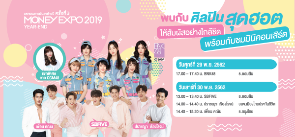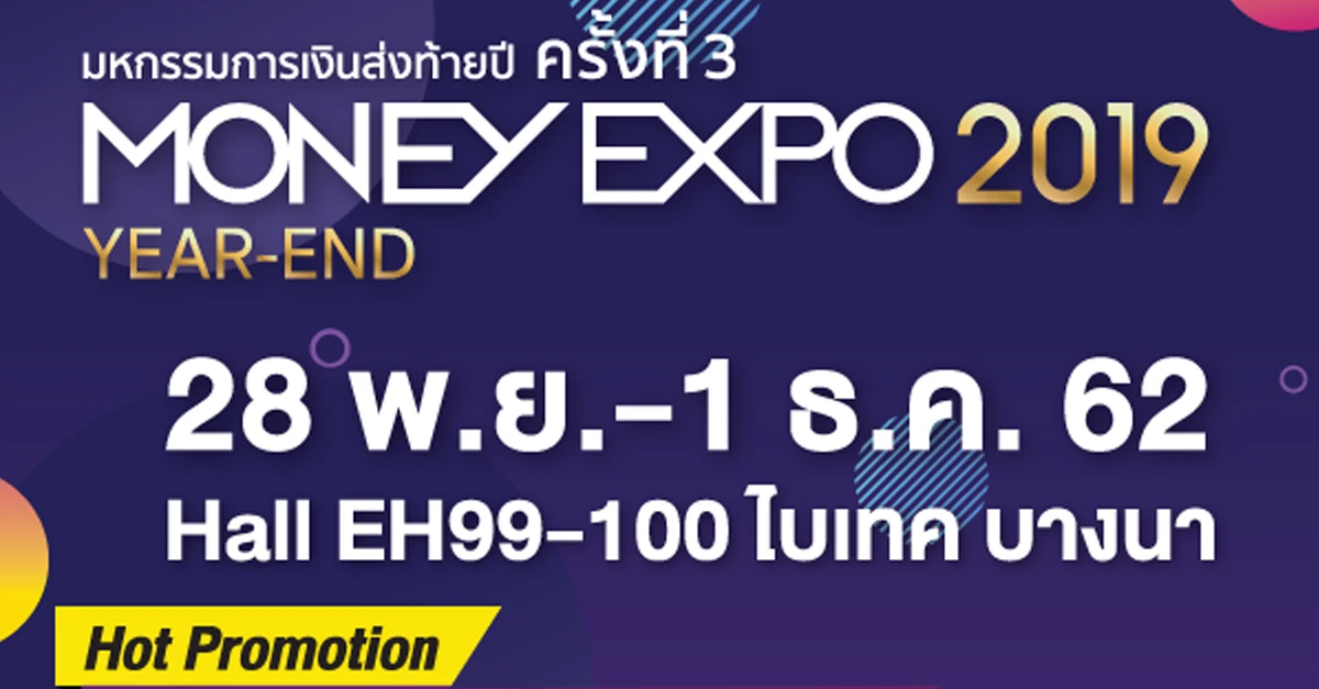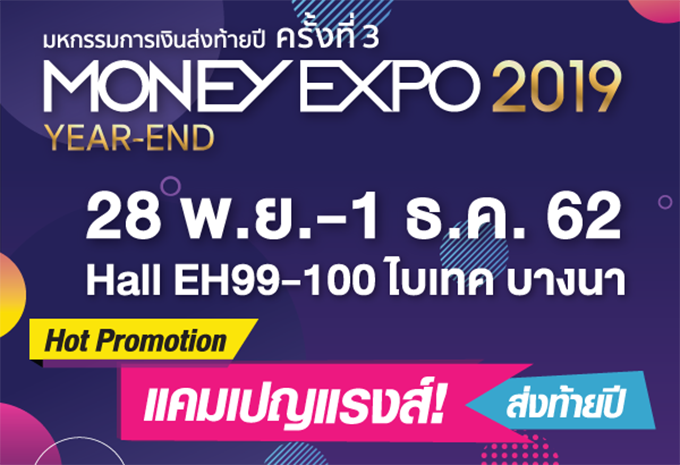 งานมหกรรมการเงินส่งท้ายปี ครั้งที่ 3 Money Expo Year-End 2019 แบงก์/นอนแบงก์/ประกัน/บล./บลจ. แข่งแคมเปญแรงโค้งสุดท้ายแห่งปี กู้บ้าน/รีไฟแนนซ์บ้าน ดอกเบี้ย 0% 6 เดือน เงินฝากเผื่อเรียกพิเศษ ดอกเบี้ยแบบขั้นบันไดสูงสุด 10% สินเชื่อ SME Start Up ดอกเบี้ย 1.99% โค้งสุดท้าย! ซื้อประกันชีวิตแถมทองคำแท่ง 20 บาท/ทัวร์โครเอเชีย กองทุน RMF & LTF ลดหย่อนภาษีและอีกมากมาย