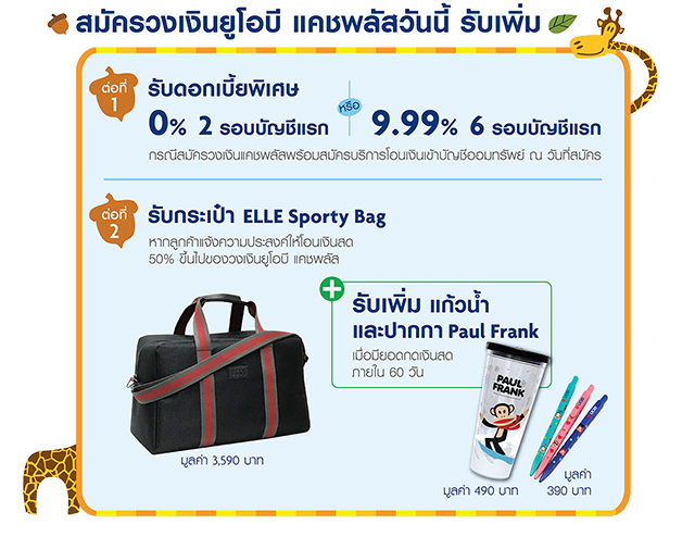 - สำหรับลูกค้าที่กดเงินสดผ่านบัตรยูโอบี แคชพลัส 1 ครั้ง ภายใน 60 วัน นับจากวันที่ธนาคารอนุมัติวงเงิน รับเพิ่มแก้วน้ำ Paul Frank มูลค่า 490 บาท และปากกา Paul Frank 1 ชุด (3 ด้าม) มูลค่า 390 บาท โดยธนาคารจะจัดส่งของกำนัลให้ท่านตามที่อยู่ในใบแจ้งยอดบัญชีภายใน 60 วัน นับจากวันที่ท่านกดเงินสดผ่านบัตร จำกัดการรับของกำนัล 1 เซต/ผู้ถือบัตร 1 ท่าน/ตลอดรายการ